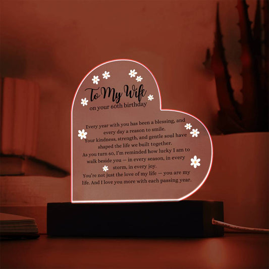 Acrylic Heart Plaque with LED Base - To My Wife 60th Birthday